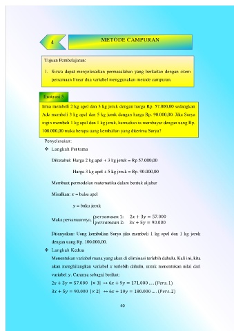 Harga 3 kg apel + 5 kg jeruk = Rp. 90.000,00