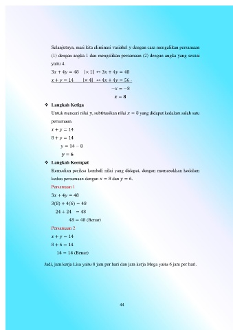 Jadi, jam kerja Lisa yaitu 8 jam per hari dan jam kerja Mega yaitu 6 jam per hari.